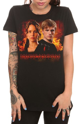 Release Date 2/22This fitted black tee from The Hunger Games features a front screen of the District 12 Tributes, Katniss Everdeen & Peeta Mellark.